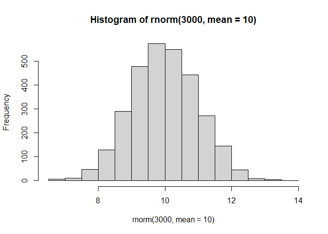 hist(rnorm(3000, mean = 10))