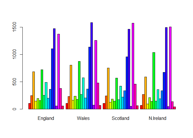 barplot(as.matrix(x), beside=T, col=rainbow(nrow(x)))