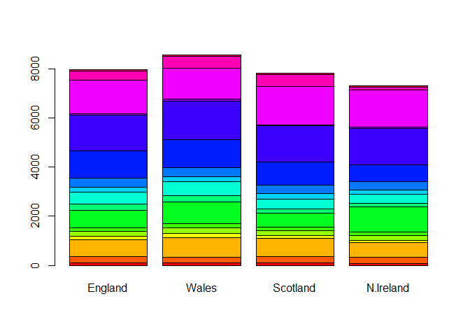 barplot(as.matrix(x), beside=F, col=rainbow(nrow(x)))