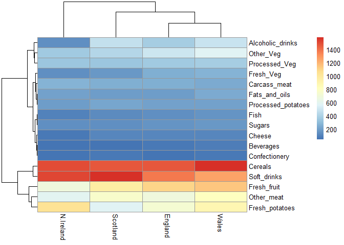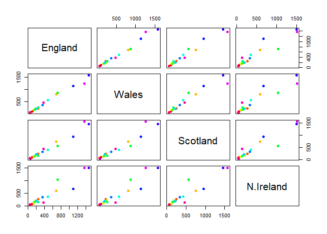 Wales and England cluster together for instance, and this It is visually more appealing, however it is not the most efficient to use when comparing it to the pairs plot.
