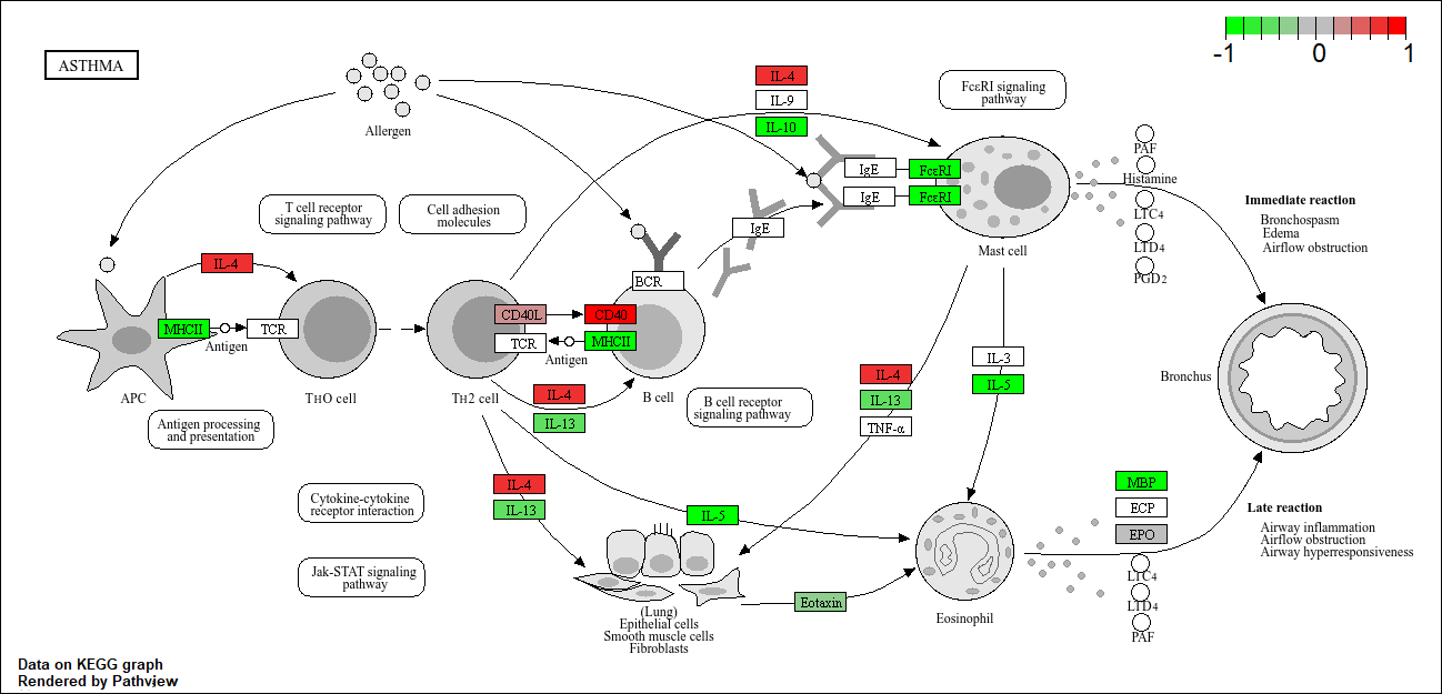 Let’s see the hsa05310 Asthma pathway with our DEGs colored up: